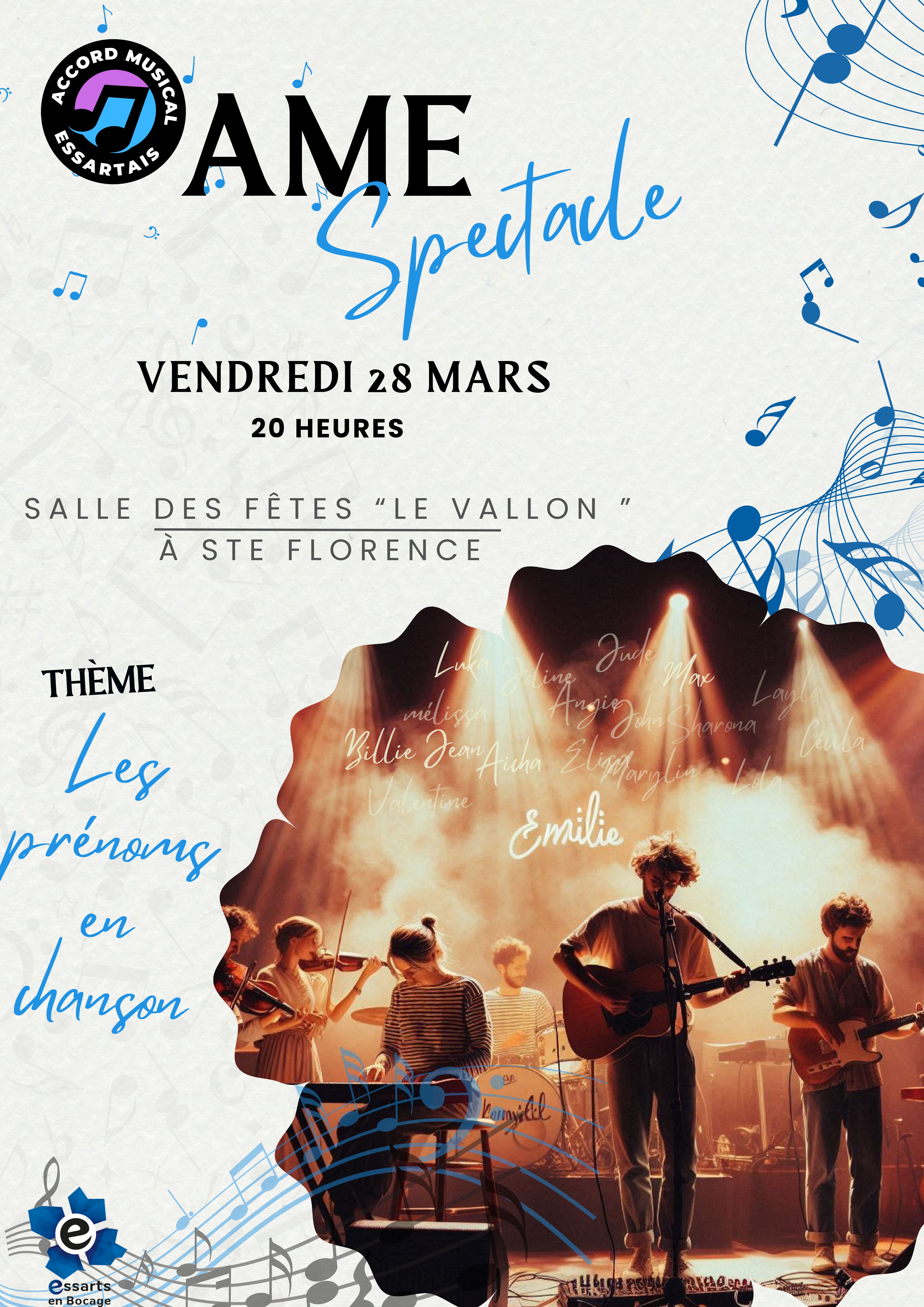 Le vendredi 28 mars prochain, l’AME présentera son nouveau spectacle à 20H à la salle du Vallon de Ste Florence sur le thème « Les prénoms en chanson ».