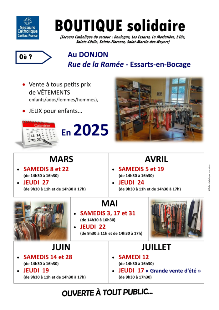 Le Secours Catholique organise une boutique solidaire le samedi 27 mars 2025, de 09h30 à 11h00 & 14h30 à 17h00.