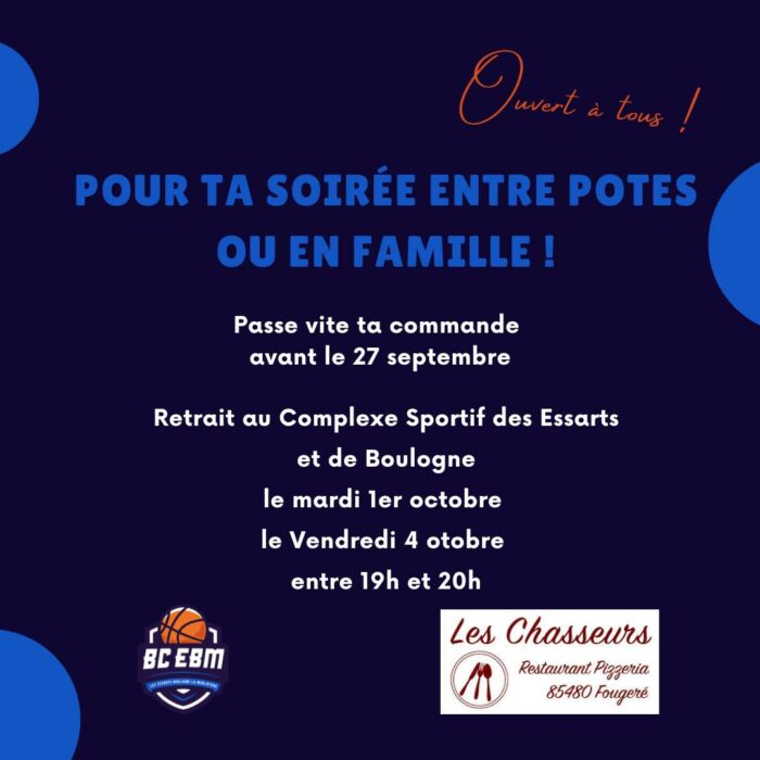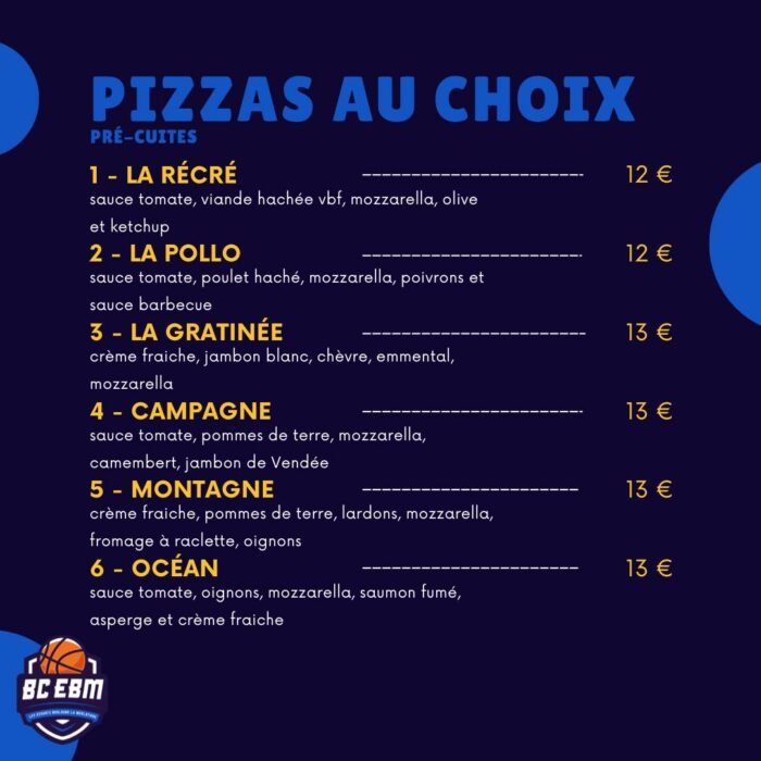 Le BCEBM organise une vente de pizzas. Passez votre commande avant le 27 septembre, le retrait aura lieu le 1er et le 4 octobre entre 19h00 et 20h00.