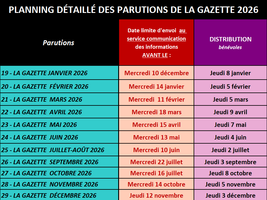 Si vous souhaitez faire apparaître un évènement ou publier un article dans La Gazette, vous pouvez envoyer vos informations par mail au service communication avant les dates limites indiquées ci-dessous. ⬇️