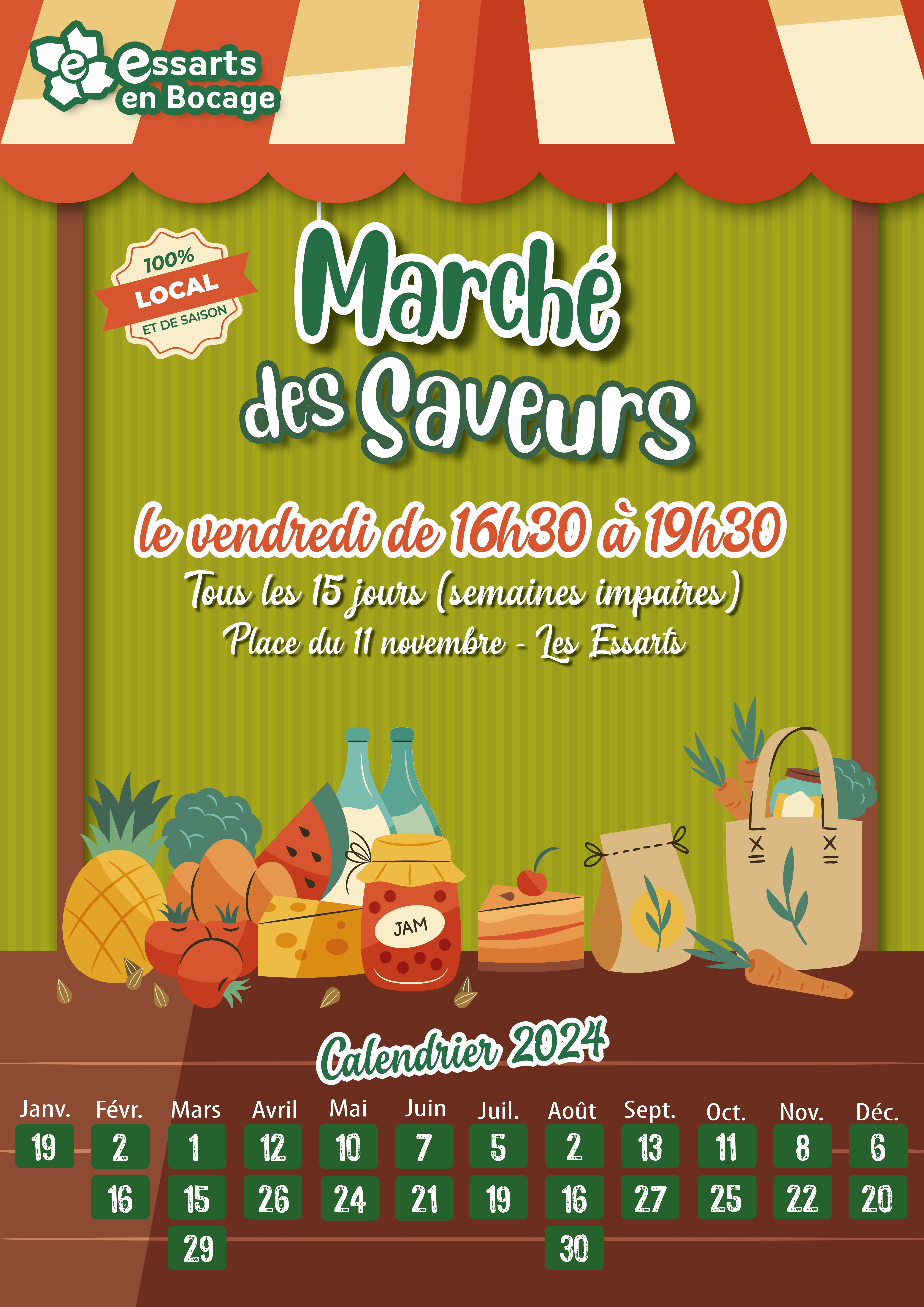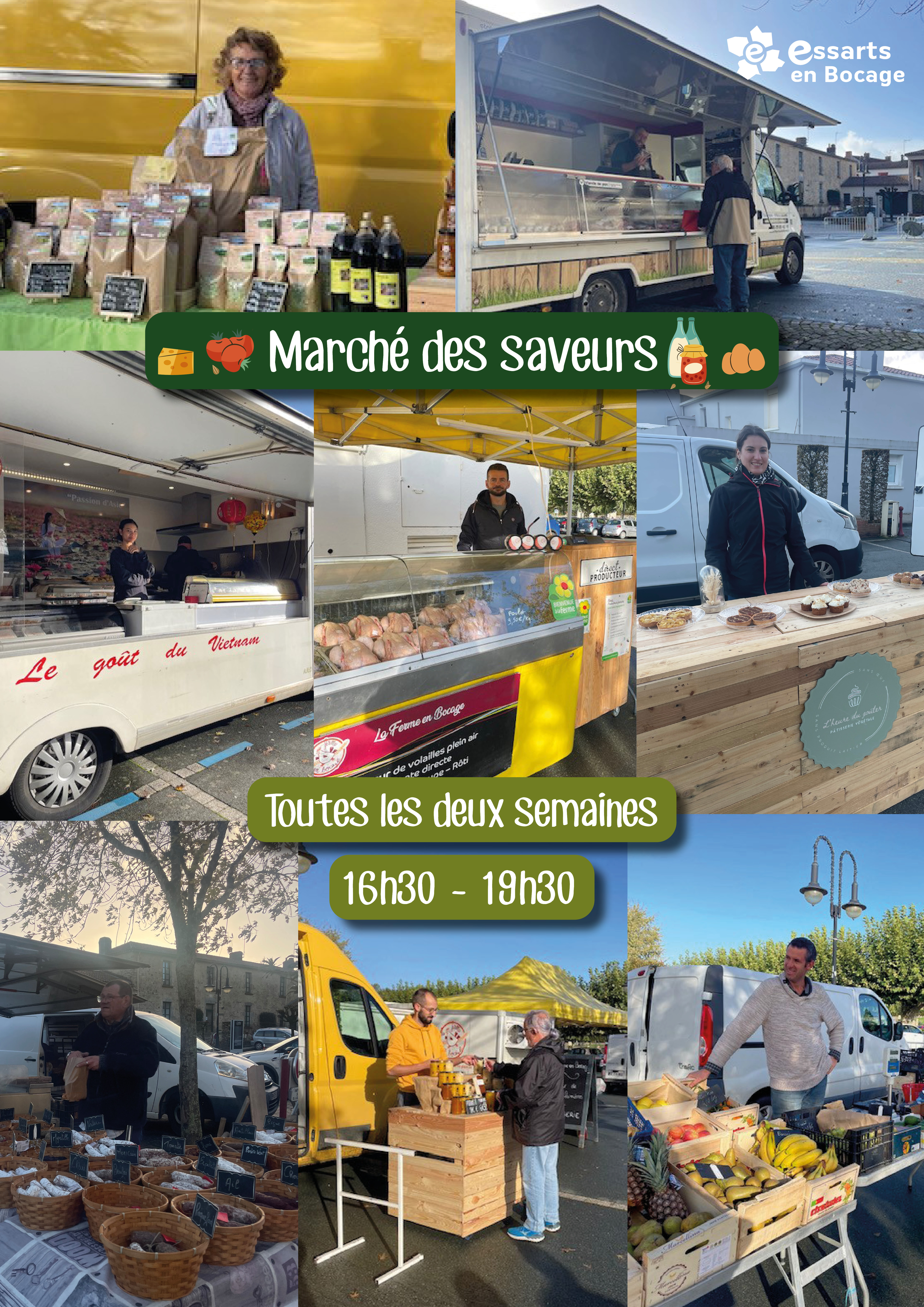 Le 1er marché des saveurs a été mis en place le vendredi 27 avril 2016 sur la volonté de la municipalité. Le travail a débuté en octobre 2015 par le lancement d’un groupe d’élus motivés et moteurs à la demande de M. le Maire pour concrétiser un projet de campagne portée par les 2 équipes. La population a été sondée sur ce projet et les 200 réponses reçues avec les nombreux messages d’encouragement ont conforté le groupe d’élus dans leur démarche. Les producteurs locaux ont été associés au projet. Chacun était force de proposition, motivé par l’initiative et content de pouvoir travailler localement. L’orientation donnée au marché était de créer des habitudes alimentaires (vente de produits essentiellement alimentaires) et dynamiser le bourg en permettant à la population de se retrouver le vendredi soir tous les 15 jours, semaines impaires, créer du lien social. Le marché offre aux associations d’Essarts en Bocage une vitrine pour se faire connaitre. Des animations musicales sont possibles. Des aménagements électriques et une mise à disposition du personnel administratif et technique ont été nécessaires pour accueillir dans de bonnes conditions les producteurs. Un règlement intérieur a été créé avec l’expertise de la directrice générale des services.
